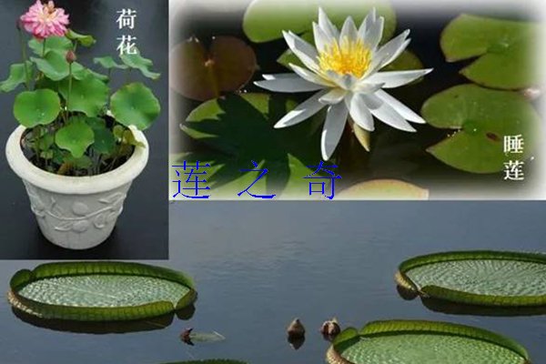 一些人很容易把荷花同睡莲混淆,原因在于两者同是水生植物;花和叶也很相似。然而两者实际上截然不同。荷花属于莲科(Nelumbonaceae)莲属(Nelumbo),是大型挺水植物,叶有浮叶和立叶之分,花和立叶要高出水面很多,熟。而睡莲为睡莲科(Nymphaeaceae)睡莲属(Nymphaea)中的大型浮水植物,叶片和花往往贴在水面上(热带性荷花也常高出水面),好似躺在水面上睡觉,花似莲,故名睡莲。睡莲的叶片都有一个半径长的裂口,开花后果实下沉水中,种子在水下的果实中发育成熟。王莲同荷花和睡莲均显著不同,叶片更大,是世界上直径最大的叶子,形似一个大簸箕或巨大的圆盘,边缘上卷,叶柄和叶背面均有很多锐利的刺。芡实同王莲最为相近,但叶片边缘不上卷,花远小于王莲,通常只用于生产芡实种子食用,很少作为观赏植物叶片边缘不开裂,果实(即带壳的莲子)在莲蓬中生长成。